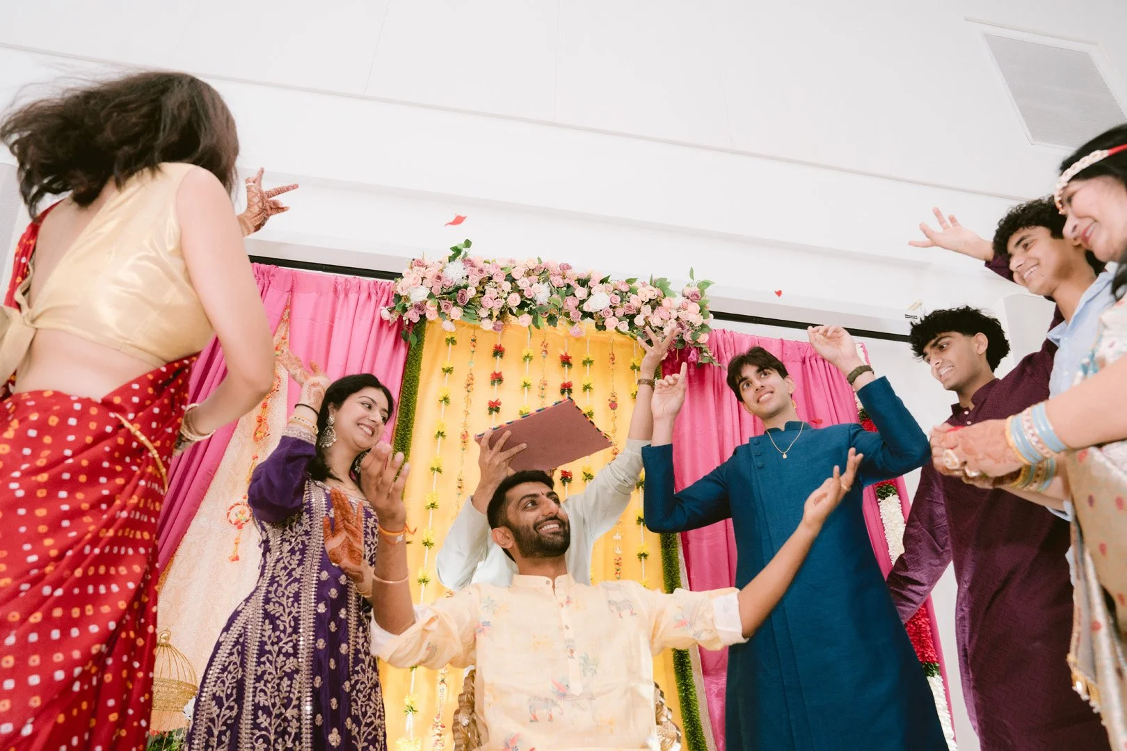 Grah Shanti is a significant pre-event that occurs prior to Gujarati weddings. The Grah Shanti pooja marks the essential final preparations for the couple before they embark on their new journey of married life together, and it is usually held a day or two before the main wedding ceremony. This important ritual serves as an auspicious start to the upcoming wedding festivities, seeking blessings from various deities to grace and bless the couple's union with love and harmony. A delightful mini haldi ceremony was then followed by the Grah Shanti Pooja, where there were many fun and memorable moments shared among family and friends.