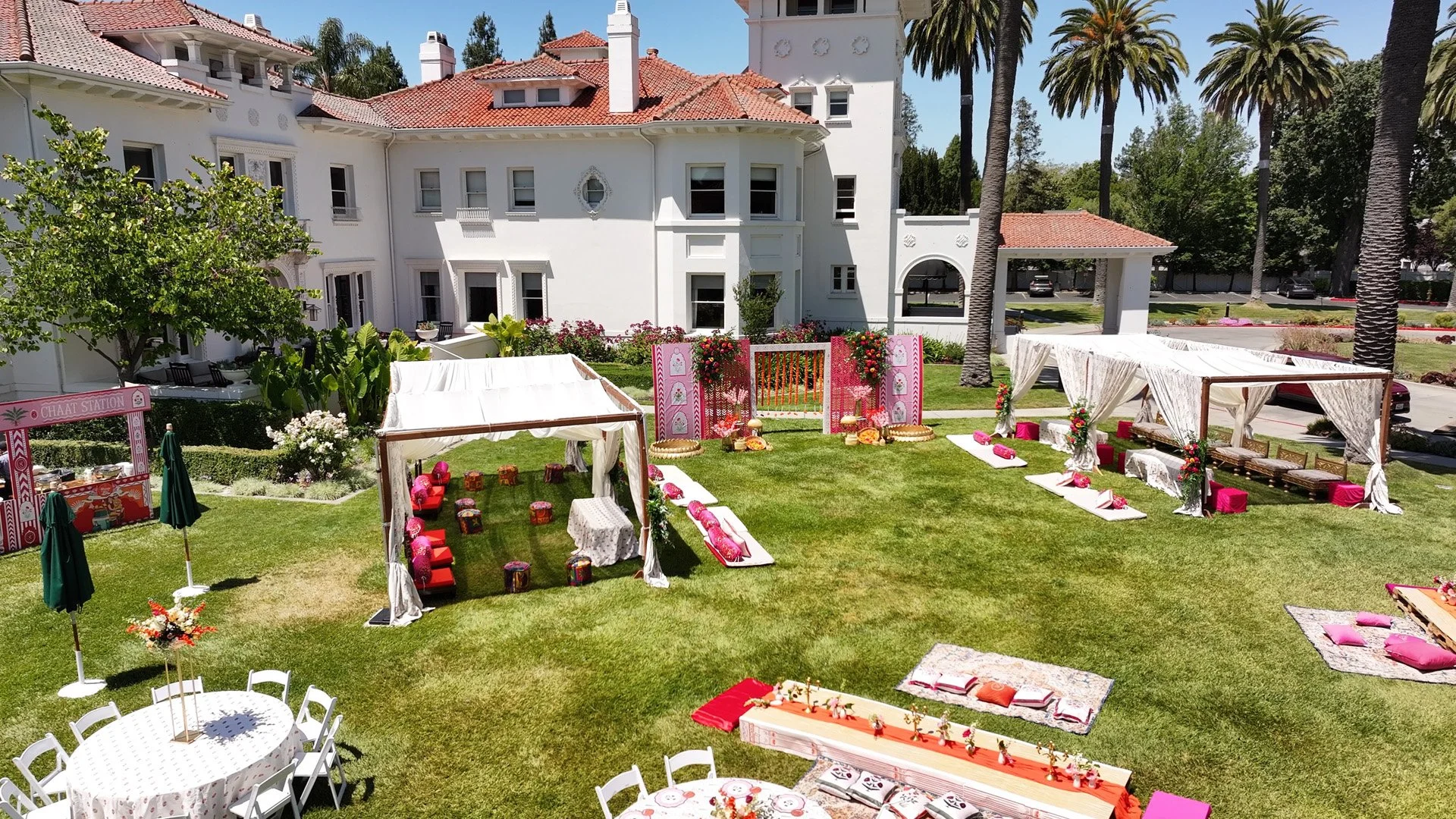 This blog is about a garden party soiree at the Hayes Mansion in San Jose to celebrate the mayoun and sangeet for our Pakistani and German fusion couple. The Social Squad from Pakistan did a great job with the decor, creating a modern bazaar and mela look. Everything was personalized, from the napkins and cups to the throw pillows and scarves. Fresh Flowers, tents, food stalls, party favors and much more! The event featured performances, mingling, and beautiful people and decor. Scroll down for beautiful photos from this event.