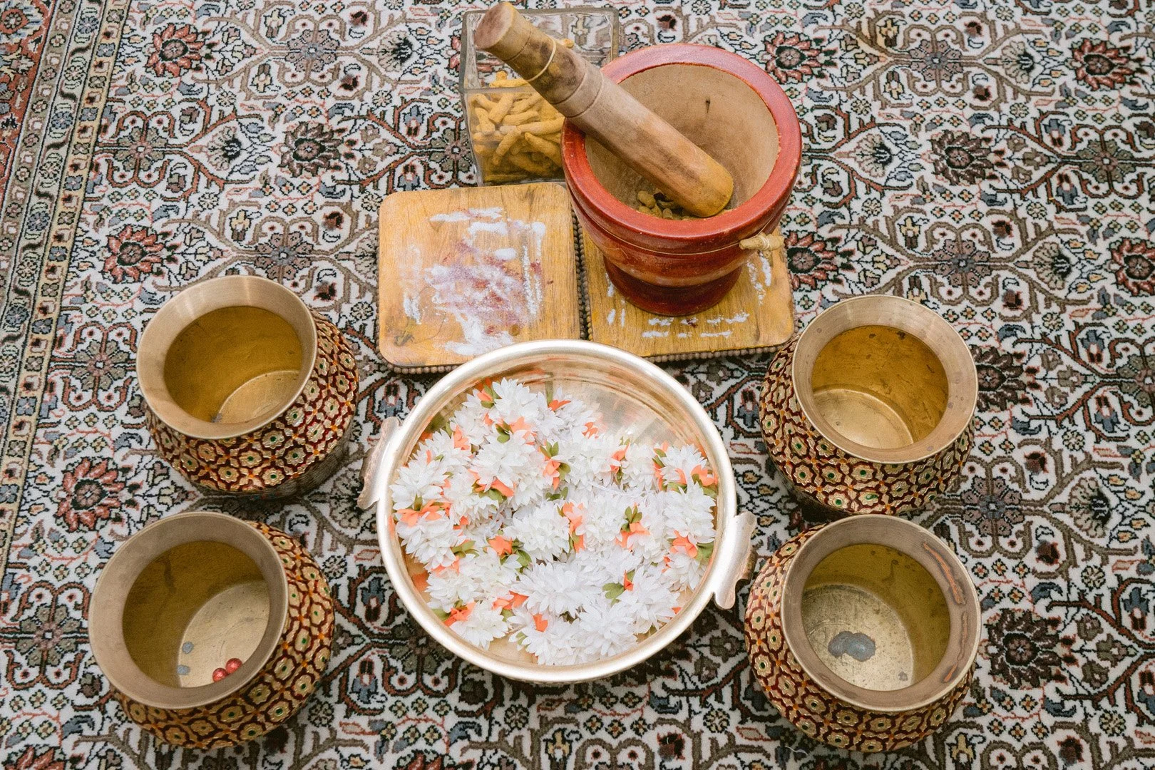 Yellow turmeric paste is applied to both bride and groom similar to haldi event at a north indian wedding. Bangles and sweets are distrubuted to friends and family. Gifts are exchanged and poojas are performed wishing the families and bride and groom a successful wedding and blessings from everyone.